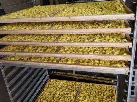一、擺盤:將采摘好的鮮花倒入托盤,鮮花不能重疊太厚。擺好的鮮花盤可以直接放入烘車上,一次多擺幾盤,全部擺放完畢后可將烘車推入烘房進(jìn)行烘干。胎菊的烘干除了菊花本身采摘時(shí)的濕度還有